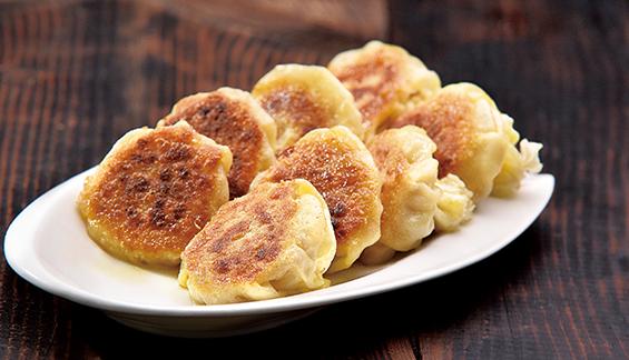 一籠燒麥稱一兩, 一壺磚茶涮肚腸; 皮薄餡大滋味足, 油煎熱蒸鮮嫩香。